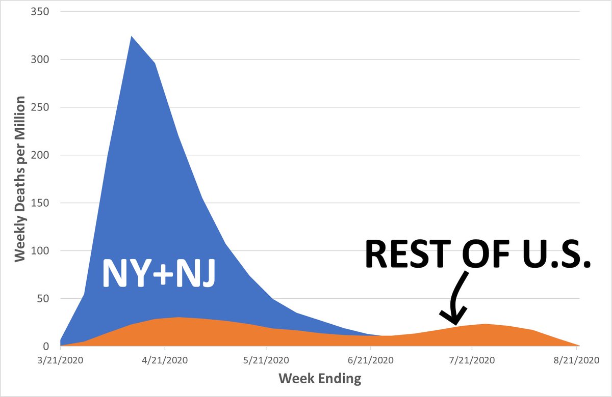 So, there's actually two pieces of data that can be gleaned from that chart I posted. The first one is the really obvious one, that the vast majority of deaths occurred in just two states. The second is on the far right end of the chart. The part where it shows current weekly deaths / million people as nearly zero. There's very little reason your job should still be at risk at this point due to the disease itself.