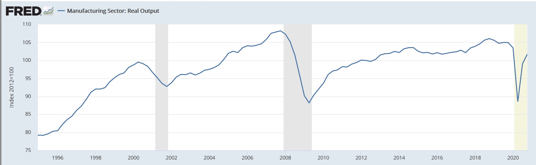 Fewer workers are employed in manufacturing, but the average worker is earning far more per hour. This is a problem? Meanwhile, American manufacturing output is significantly higher today than it was when the WTO was established. In fact, even at the lowest point of last year's COVID-19 recession, manufacturing output was still higher than it had been in any year before 1997.