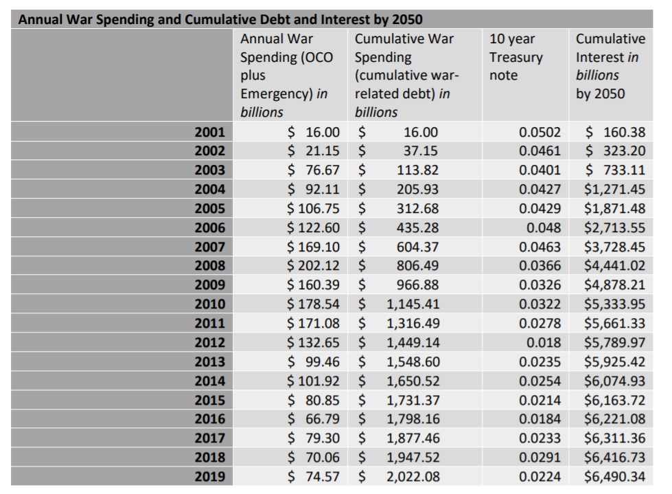 Peltier's research shows that the interest costs of the post-9/11 wars in Afghanistan and Iraq had already topped $1 trillion. By the end of the current decade, interest on the war debt will likely exceed the final official tally of the wars' cost. And the final price tag for those operations could eventually exceed $6 trillion—with American taxpayers still paying the tab when the 50th anniversary of 9/11 arrives.