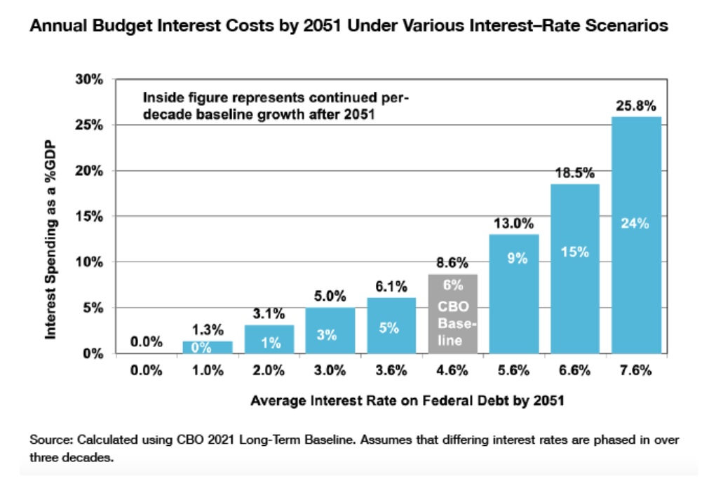A one percentage point increase in interest rates translates into a $30 trillion increase in interest costs on the national debt.