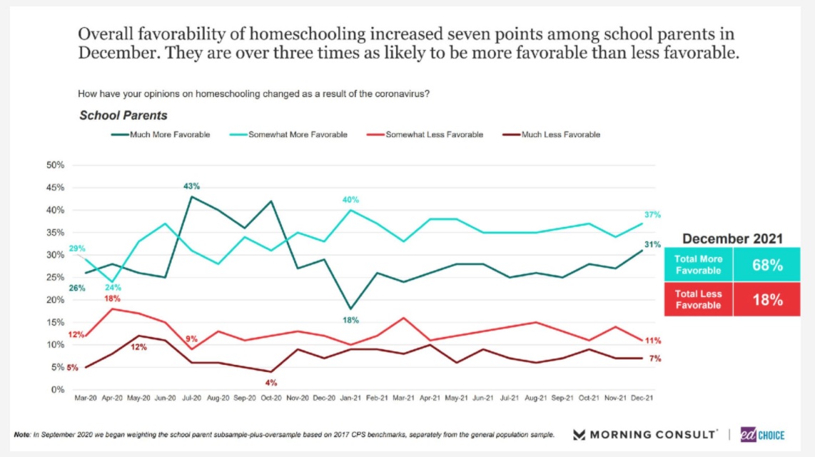 "December 2021 was one of the highest homeschooling favorability rates since we began asking this question," writes John Kristof, a research analyst at Ed Choice. "Those identifying themselves as 'much more favorable' toward homeschooling was at its highest point since October of 2020."