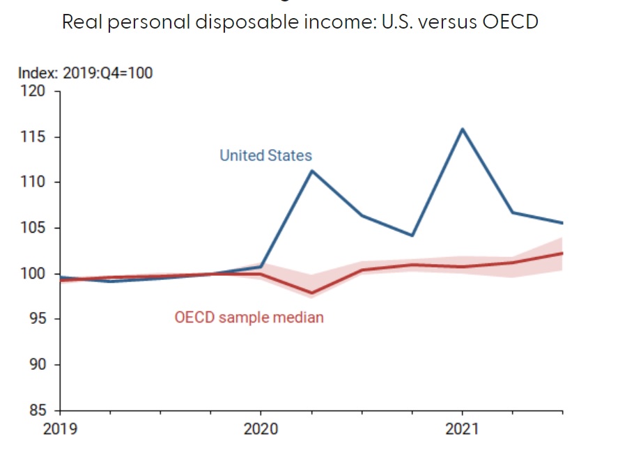 Governments all over the world spent heavily to combat the pandemic, of course, but few handed out cash directly to citizens as the American government did. The four Federal Reserve researchers track sharp increases in "inflation-adjusted disposable personal income"—in layman's terms, excess spending cash—reported by American households over the past two years. "Throughout 2020 and 2021, U.S. households experienced significantly higher increases in their disposable income relative to their OECD peers," they write.