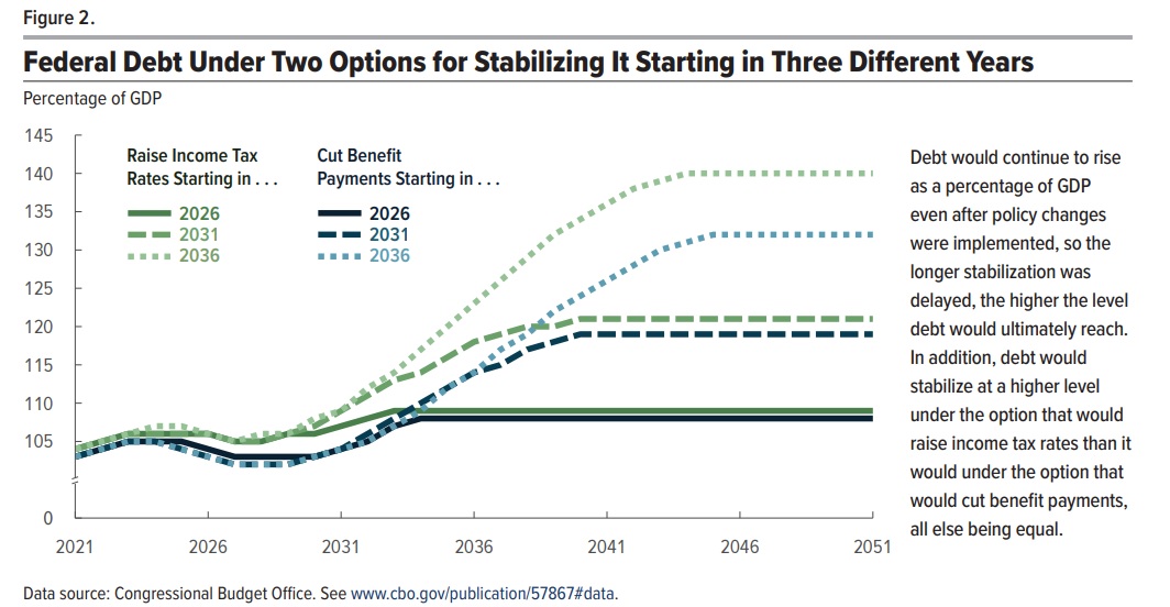 The CBO report charts three prospective courses based on assumptions about when Congress might start implementing necessary changes to face this tsunami of a problem: by 2026, 2031, or 2036.