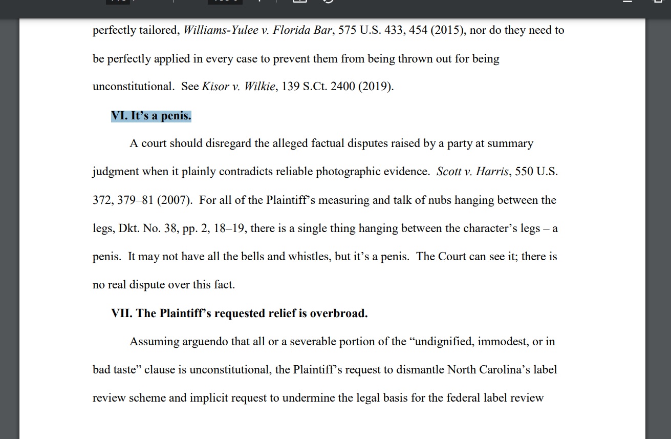 "It may not have all the bells and whistles, but it's a penis," attorneys for the North Carolina ABC wrote—yes, really—in response.