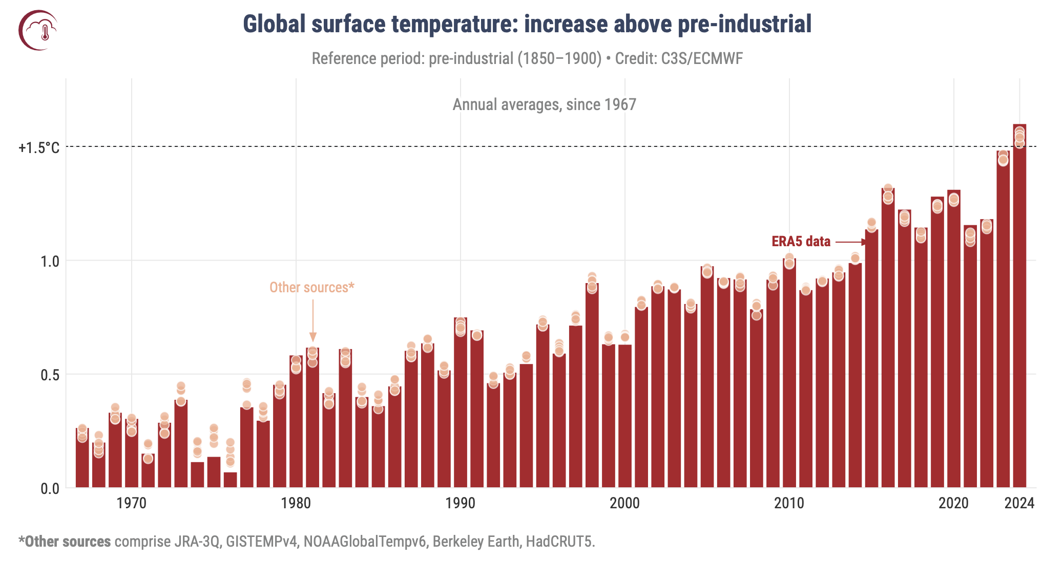 Global average temperatures have been rising concomitant with the increase in atmospheric CO2. In 1992, the global average temperature was about 0.5 degrees Celsius (0.9 degrees Fahrenheit) above the 1850–1900 baseline. In the succeeding 32 years, the global average temperature has risen, reaching 1.55 degrees Celsius (2.8 degrees Fahrenheit) above the baseline in 2024. In fact, 2024 was the hottest year in the instrumental record, and the last 10 years have been the 10 warmest years on record.