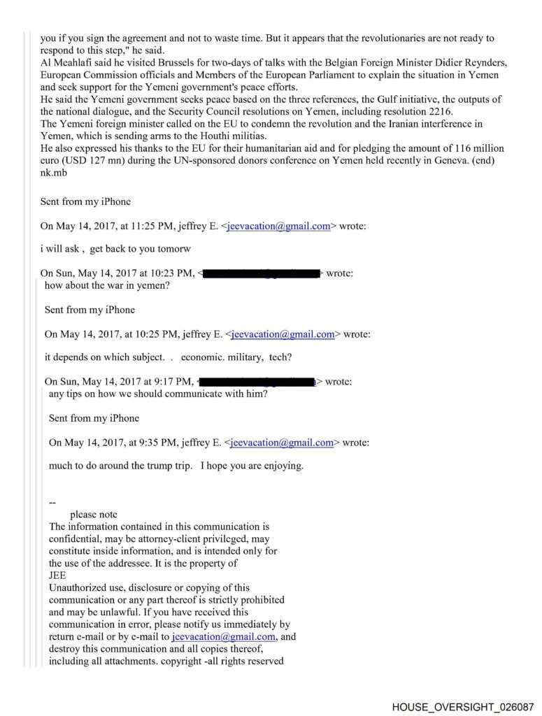 The House Oversight Committee's disclosures add two other countries to the mix. Along with the mysterious figure asking about favors for Kuwait—the name is completely redacted—the emails show that Epstein was in contact with an influential man in Qatar referred to only as "Jabor Y."