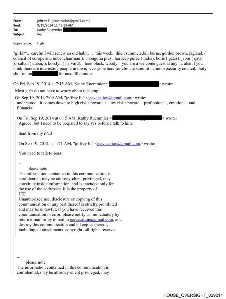 In a 2014 email, Epstein joked to a friend about the danger that her talk about "girls" will "renew an old habit." Then he listed all the meetings he had lined up during the U.N. General Assembly in New York. They included power brokers from America, Europe, the Middle East, and beyond.