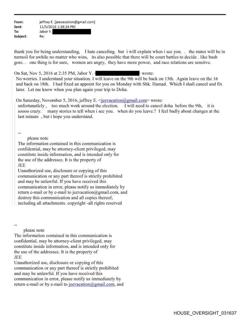 In November 2016, shortly before the U.S. election, Epstein apologized to Jabor for canceling an audience that Jabor had arranged with Hamad bin Khalifa Al Thani, the then-retired emir of Qatar. "[T]oo much work around the election," Epstein wrote, adding that "the states will be in turmoil for awhile no matter who wins" and promising to "explain when i see you."