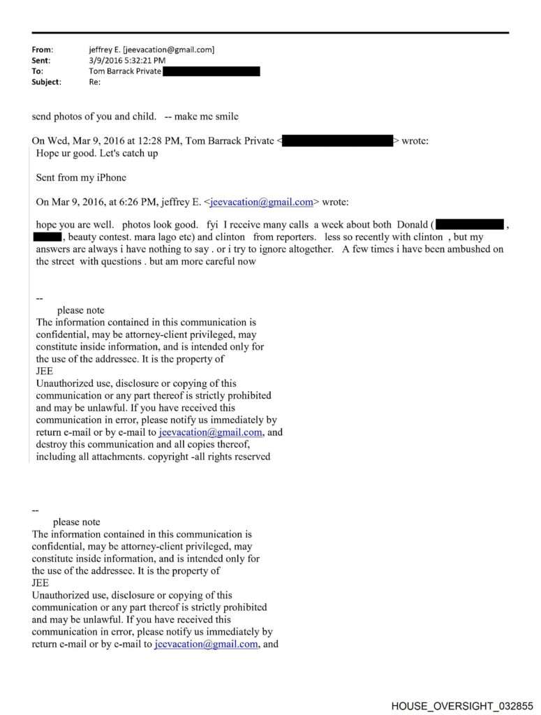 In March 2016, Epstein and Barrack made small talk via email. Barrack asked Epstein to "catch up," while Epstein complained about the constant questions from the media about his relationships with Trump and former President Bill Clinton. "[S]end photos of you and child," Epstein added. "[M]ake me smile."