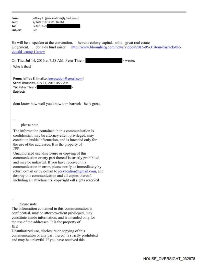 A few months later, Epstein wrote to businessman Peter Thiel, "dont know how well you know tom barrack he is great." Epstein would go on to introduce Thiel and Barrack separately to Russian Ambassador to the United Nations Vitaly Churkin, according to schedules obtained by The Wall Street Journal. Thiel told the Journal that Epstein was "a crazed networker and low on substance," adding, "I didn't think enough about what Epstein's agenda might have been."