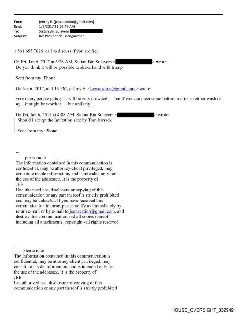 In January 2017, according to the House Oversight Committee emails, Epstein told Emirati businessman Sultan Ahmed bin Sulayem that "it might be worth it" to accept an invitation from Barrack to attend Trump's inauguration. "Do you think it will be possible to shake hand with trump," bin Sulayem wrote back. Epstein told bin Sulayem to call him on the phone.