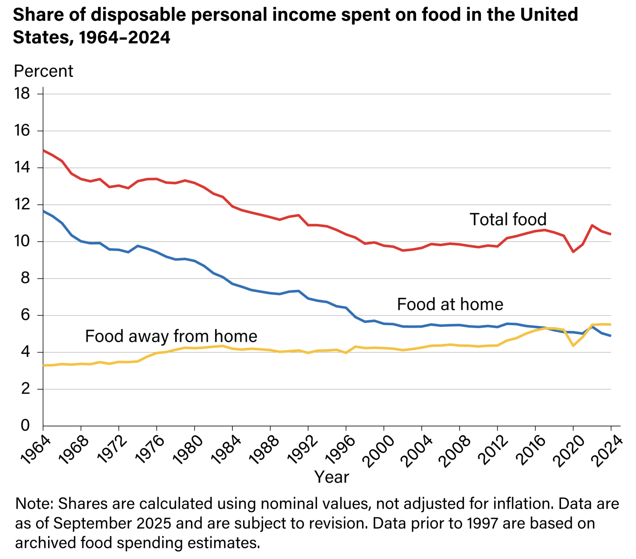 At the aggregate level, a crude calculation finds that in 1960, 11.4 percent of total GDP was spent on purchasing food for personal consumption. In 2025 that has fallen to 5.1 percent of GDP. Basically, as their incomes rise, Americans spend more money on food but it represents a smaller share of their income, and the proportion spent on nonfood items increases. Real U.S. disposal income per capita has increased from $13,500 in 1960 to nearly $53,000 today. After tax, personal disposable income hovers just above 70 percent of total GDP.