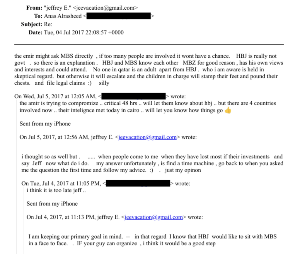 "I am keeping our primary goal in mind. in that regard I know that HBJ would like to sit with MBS in a face to face. . IF your guy can organize, i think it would be a good step," Epstein wrote in a July 2017 email to Anas al-Rasheed, a Kuwaiti professor who used to be a cabinet minister. (MBS is the nickname of Saudi Crown Prince Mohammad bin Salman.) That "goal" seems to have been an end to the split among Gulf states.