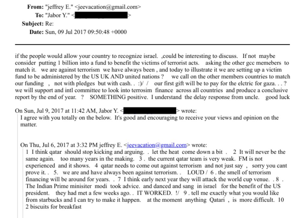 "I think qatar should stop kicking and arguing.. let the heat come down a bit," Epstein wrote to Jabor Y., a man who had previously managed Epstein's meetings with HBJ, in July 2017. Epstein implied that courting Israel could be the key to breaking out of Qatar's isolation.