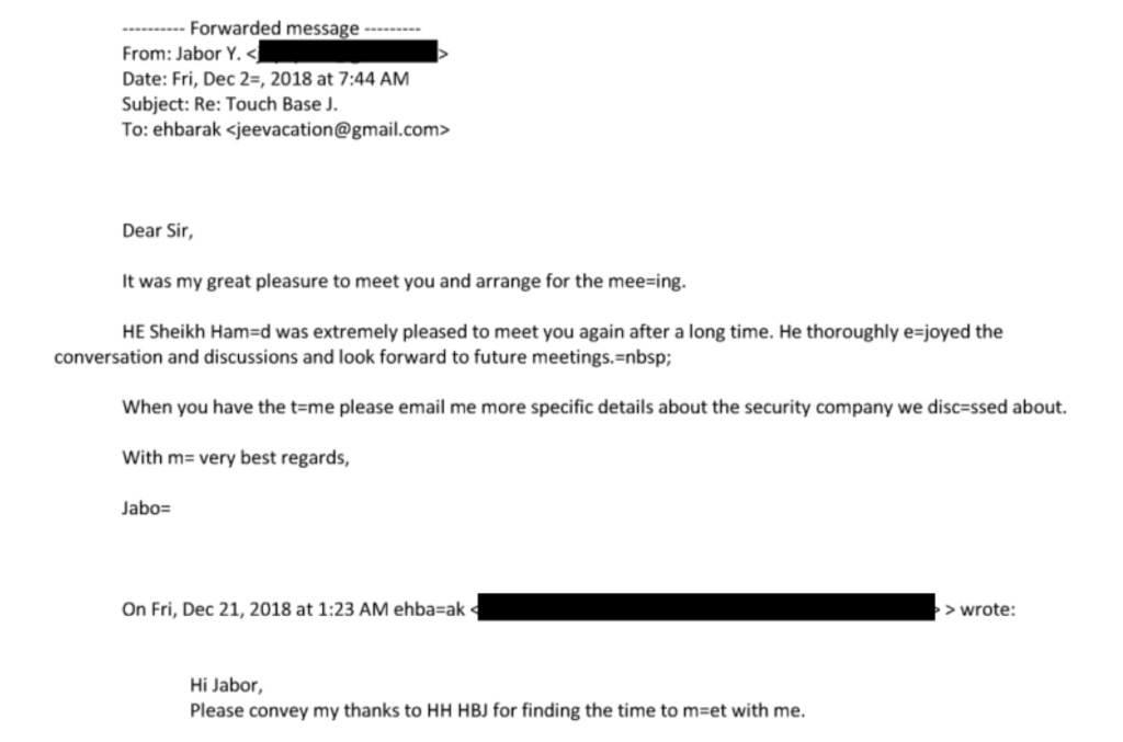 A little over a year into the Gulf crisis, Epstein brokered the meeting between HBJ and Barak. In November 2018, Epstein wrote to Barak: "just left hbj. He would like to sit with you." Then he wrote an email introducing Barak and Jabor Al Thani.