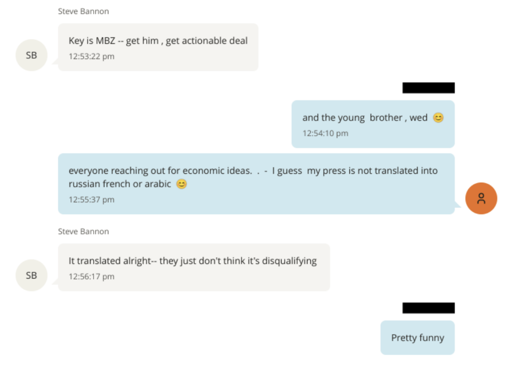 On December 11, 2018, Epstein asked Bannon to "explain to your boys that the lynchpin in the middle east is Qatar , blockade lifted. they can help on many fronts. many." Bannon responded that Emirati President Mohammed bin Zayed is the "key" to an "actionable deal."