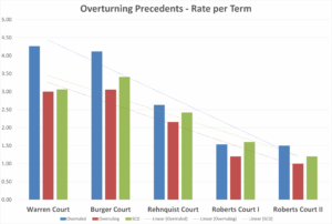 If one divides the Roberts Court into the first Roberts Court (2005-2020) and the second Roberts Court (2020-present), the rate at which the Court has overturned precedents is actually lower in the second Roberts Court (although for one of the three measures, the difference is minimal).