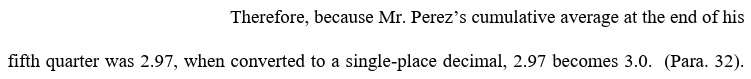 In regard to the termination of Mr. Perez's enrollment in the PA Program, the Handbook provides that students may proceed to the clinical phase if they have "a minimum cumulative GPA of 3.0." [The motion used Perez as a pseudonym for Penzo, but the district court refused to allow pseudonymity in this case, and thus used Penzo's actual name. -EV] In fact, all references in the Handbook to a student's minimum cumulative average present the minimum as a single-place decimal number, i.e., 3.0 rather than 3.00, and the only reference to a two-place decimal, i.e., 3.00, is on page 34 and is in reference to a course grade rather than a cumulative average. Moreover, the Handbook indicates via a chart on page 34 that South College applies standard decimal-rounding rules by showing that the letter grade "A" is applied for scores of 89.50% and higher, whereas 79.50% to 89.49% constitutes a "B" letter grade. Therefore, because Mr. Perez's cumulative average at the end of his fifth quarter was 2.97, when converted to a single-place decimal, 2.97 becomes 3.0