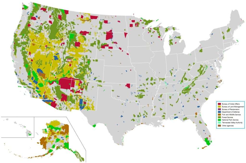The federal government owns approximately 640 million acres of the 2.4 billion acres that constitute the United States of America. You might be astonished to know that less than one half of that total consists of our invaluable Great National Park system, our U.S. protected forest lands, and our protected grasslands. Moreover, the federal government's holdings are almost entirely in twelve western states, where they create weird real estate markets, for reasons that can only be characterized as an historical accident. The map below shows federally owned land in various colors other than red (Indian reservations) and grey (other land):