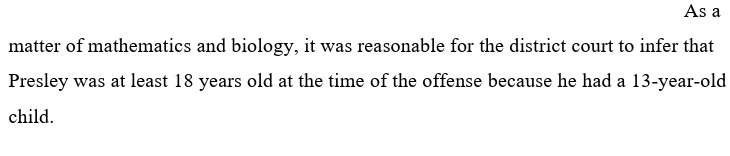 Even further, Presley's job required him to hold a commercial driver's license. By statute, that license is not available to individuals under 18. We presume trial courts know the law. See So, it was reasonable for the district court to infer Presley's age at the time of the offense based on his employment as a truck driver during the relevant timeframe….