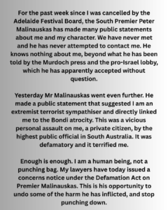 The Adelaide Book Festival chose to disinvite her thereafter, on the vague grounds that it would not be "culturally sensitive" to have her after the Bondi atrocity.