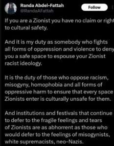 In response, she accused the Festival of anti-Palestinian racism, which in turn led to widespread withdrawals of other authors from the Festival on either anti-censorship or anti-racism grounds, which in turn led to the cancellation of the Festival this year.