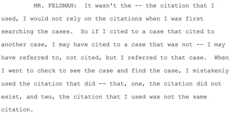 In short, Mr. Feldman acknowledged ending up with citations that "did not exist," but failed to provide a coherent explanation as to how. Was the error a product of AI hallucination from the initial drafting stage? Was it somehow a case name mismatch on Google Scholar (setting aside the greater importance of the reporter citation)? Did another case improperly cite Mr. Feldman's case, accidentally supplying him the wrong citation? Did an AI program introduce errors at the cite-check stage where none had existed previously? Representative of much of his colloquy with the Court, Mr. Feldman's explanations were thick on words but thin on substance.